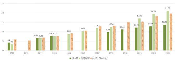 分析茶葉區域公用品牌價值數據發現,崂山茶區域公用品牌價值雖在逐年增長(zhǎng),但提升速率相當緩慢。根據浙江大學CARD中國農業品牌研究中心、中國農業科學院茶葉研究所《中國茶葉》雜志、浙江大學茶葉研究所等機構發布的中國茶葉區域公用品牌價值評估榜單數據顯示,2010年,崂山茶品牌價值4.2億元,尚居於(yú)山東省茶品牌榜首,2012年被日照綠茶趕超。到2021年,崂山茶的品牌價值提升至13.73億元,但與日照綠茶之間的距離正逐步加大。