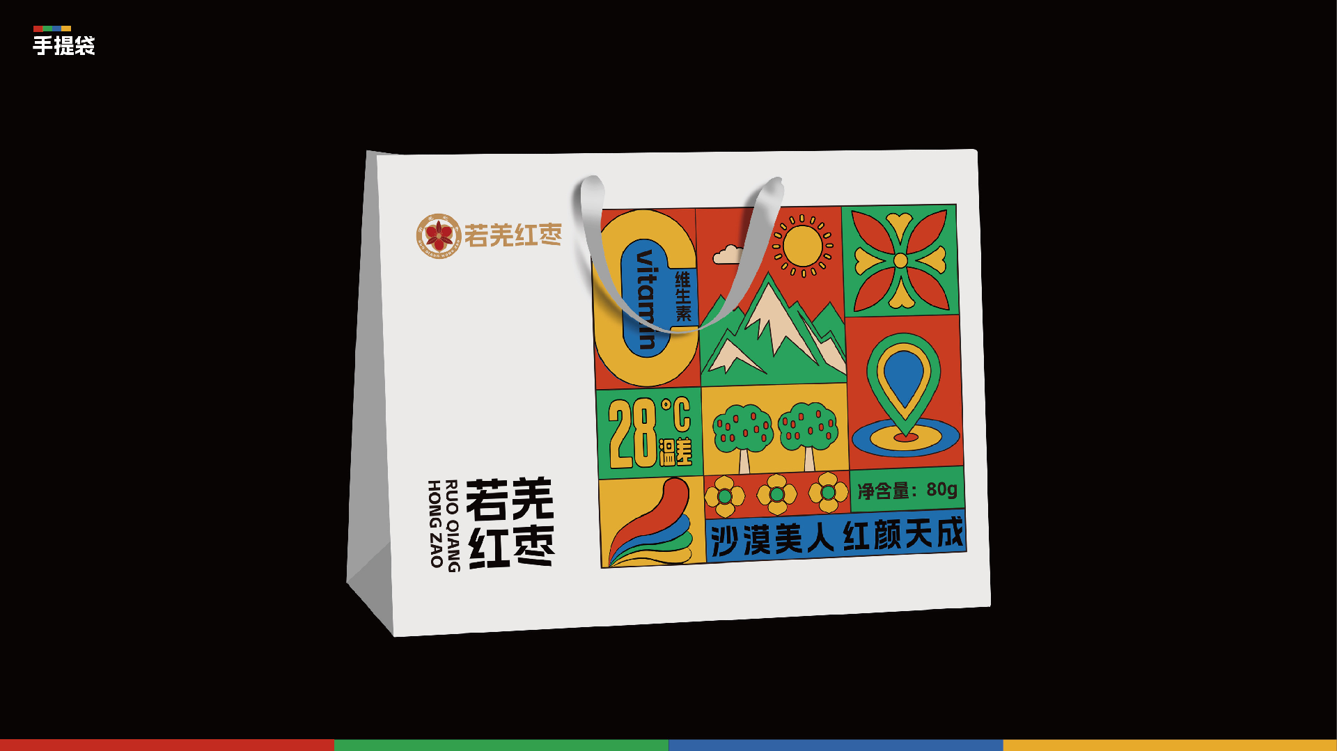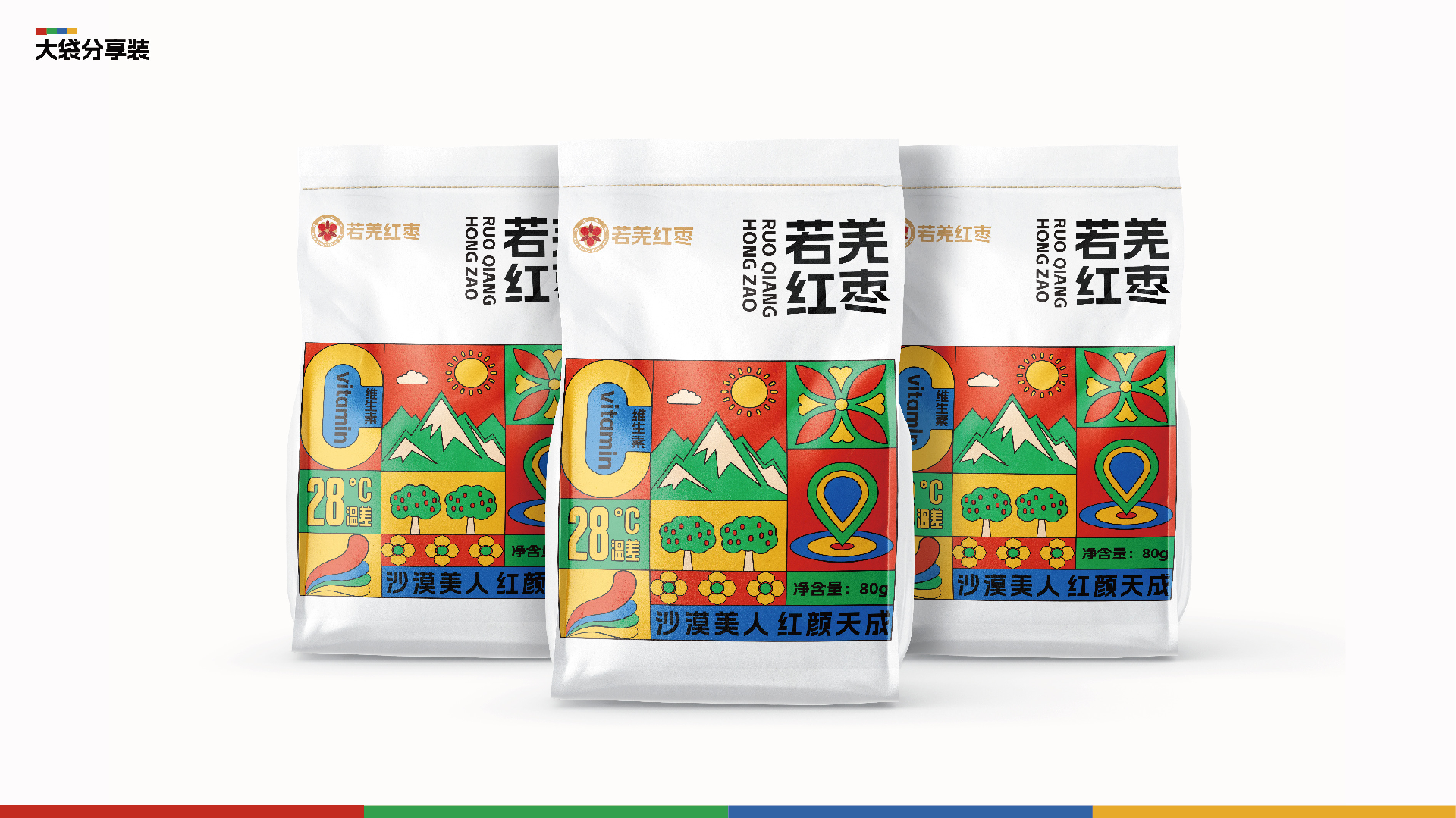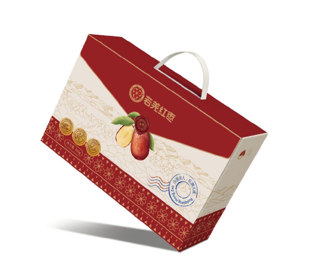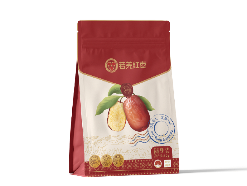 品牌主形象是在現有品牌商标的基礎上進行優化升級。顔色,以沙漠色呼應品牌“沙漠美人棗”的定位,以紅色凸顯産(chǎn)品,傳遞“沙漠美人”特色,增加食欲感。增加“若羌紅棗”品牌名稱(chēng)比例,進一步清晰展示品牌,增強消費印象。