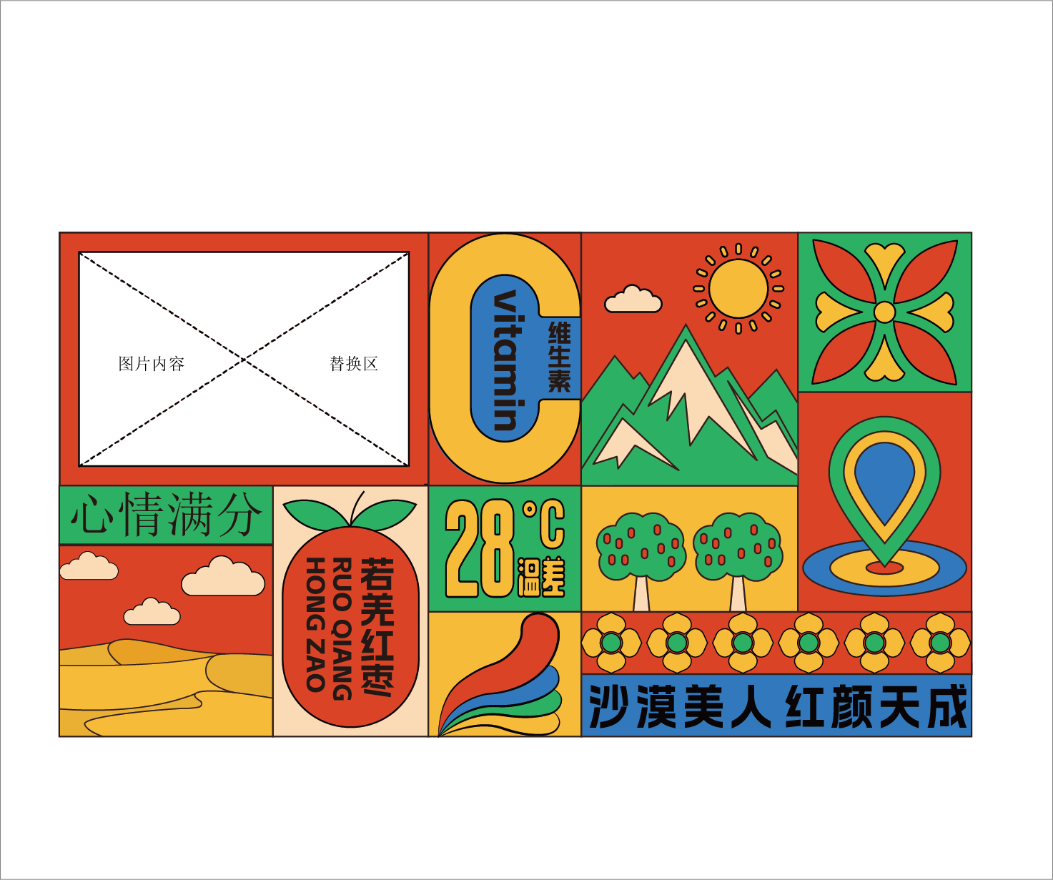 品牌輔助形象二主要應用於(yú)電商場景,融合紅棗特性、若羌環境、文化标志、消費心情等元素,以明麗的色彩、簡約的筆(bǐ)觸創意趣味形象,使若羌紅棗的電商包裝跳脫出一般形式,創意表達“吃紅棗讓人心情滿分、顔值加分”的美人棗屬性。