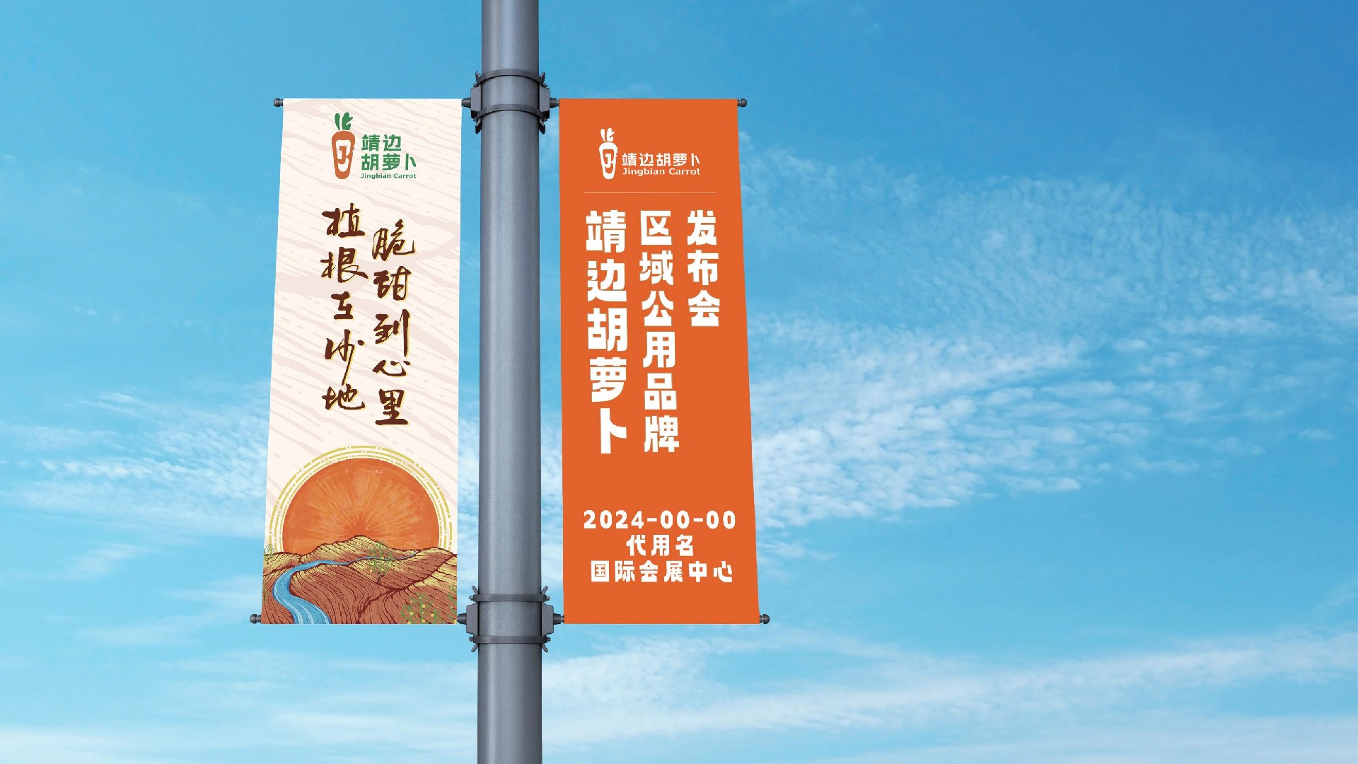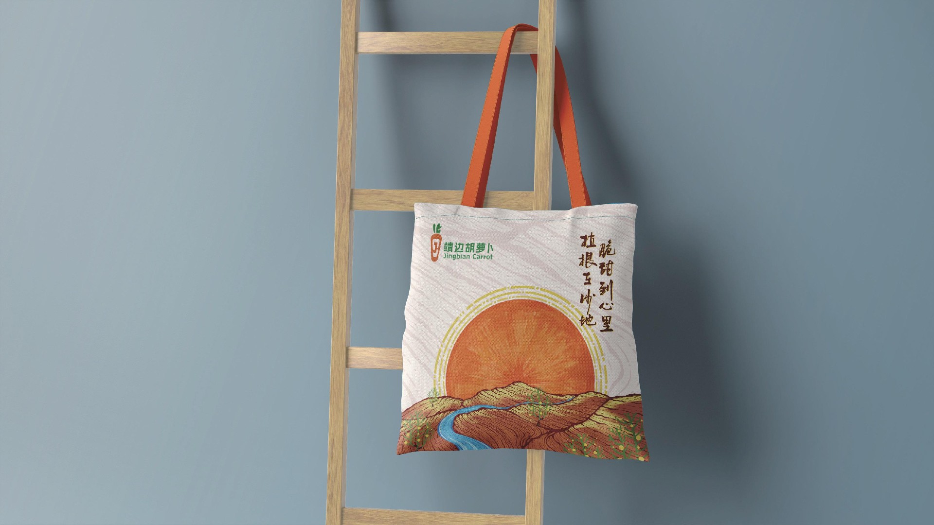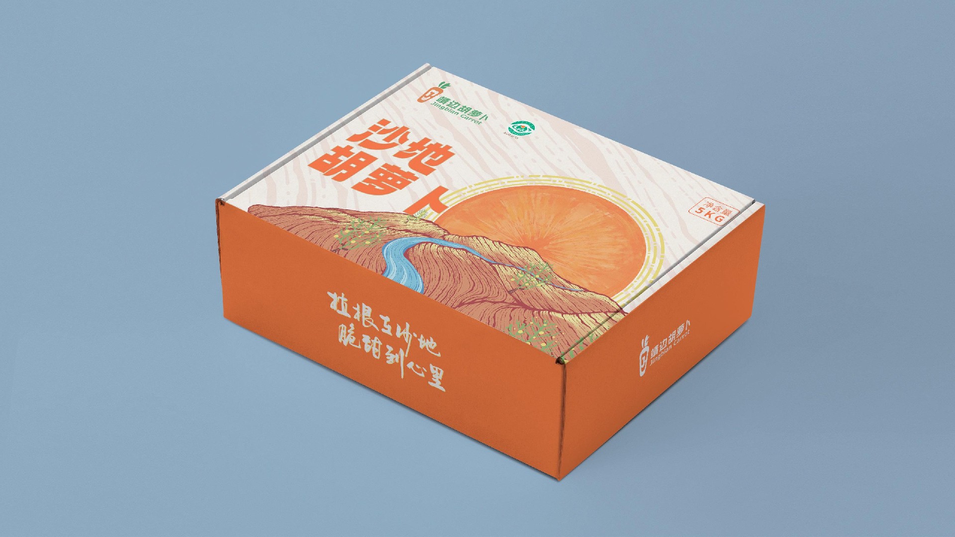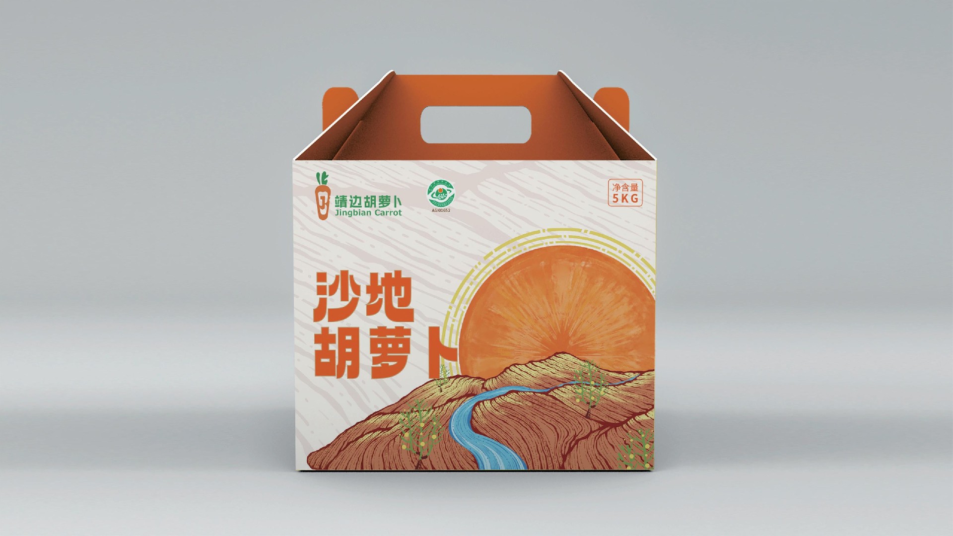 在品牌輔助圖形的設計上,以誇張手法,在靖邊最具代表的丹霞地貌之上,描繪出一輪冉冉升起的旭日,體現出豐富的光照對靖邊農産的重要意義,賦予品牌美好願景。旭日同時又是靖邊胡蘿蔔的切面,向消費者展現其果肉細膩、芯細分界不明顯的内在特征。周圍的金邊與“靖邊”同音,也寓意靖邊胡蘿蔔的金色品質。一條象征紅色文化,滋養靖邊一方土地的“小河”蜿蜒而過,爲畫面增添瞭(le)一抹靓麗的色彩。以大漠之上無邊曠野的場景描繪,帶給消費者對於(yú)靖邊胡蘿蔔的無盡美好想象。