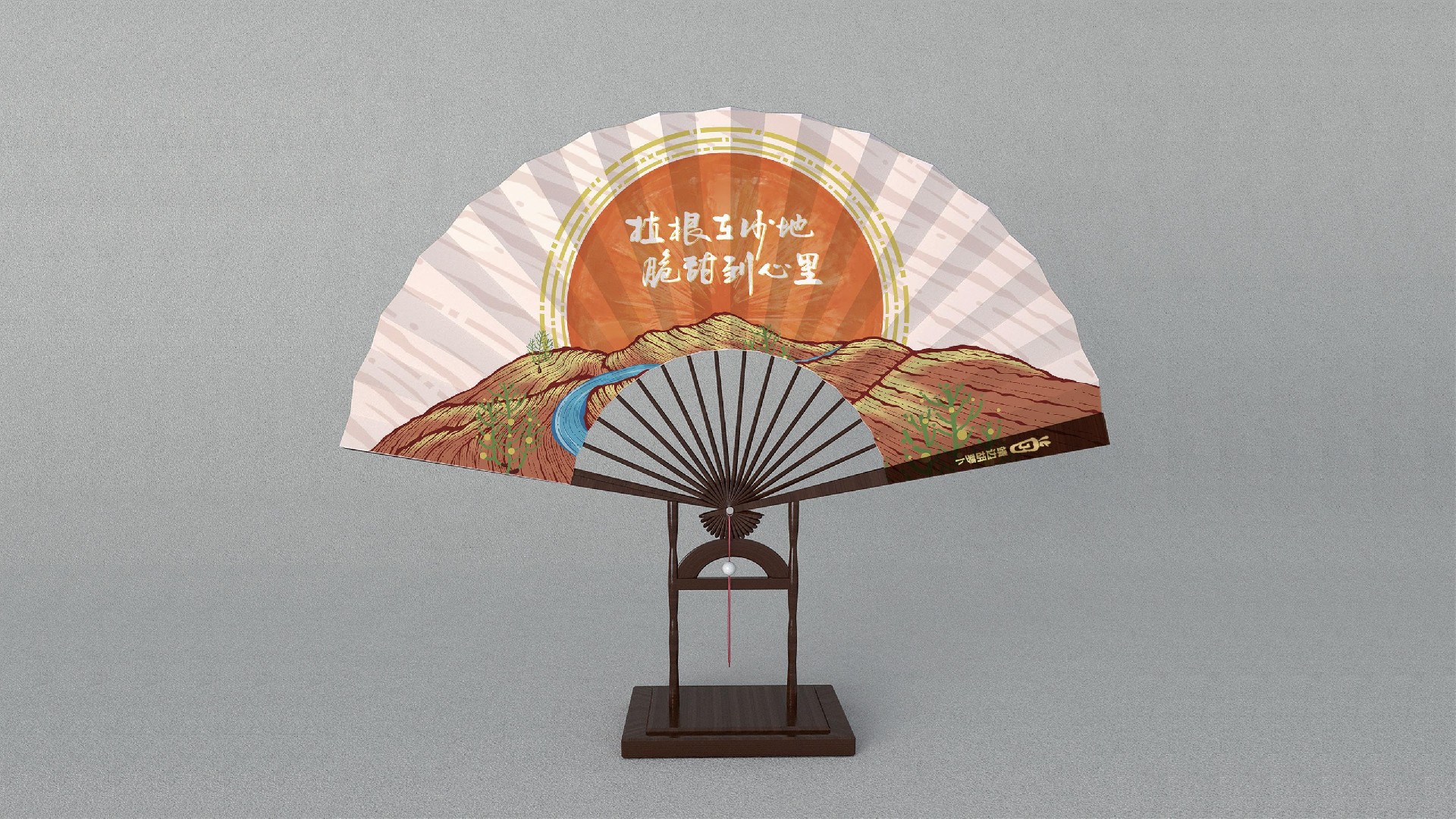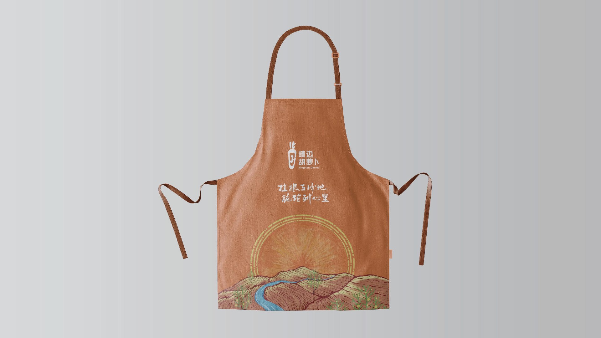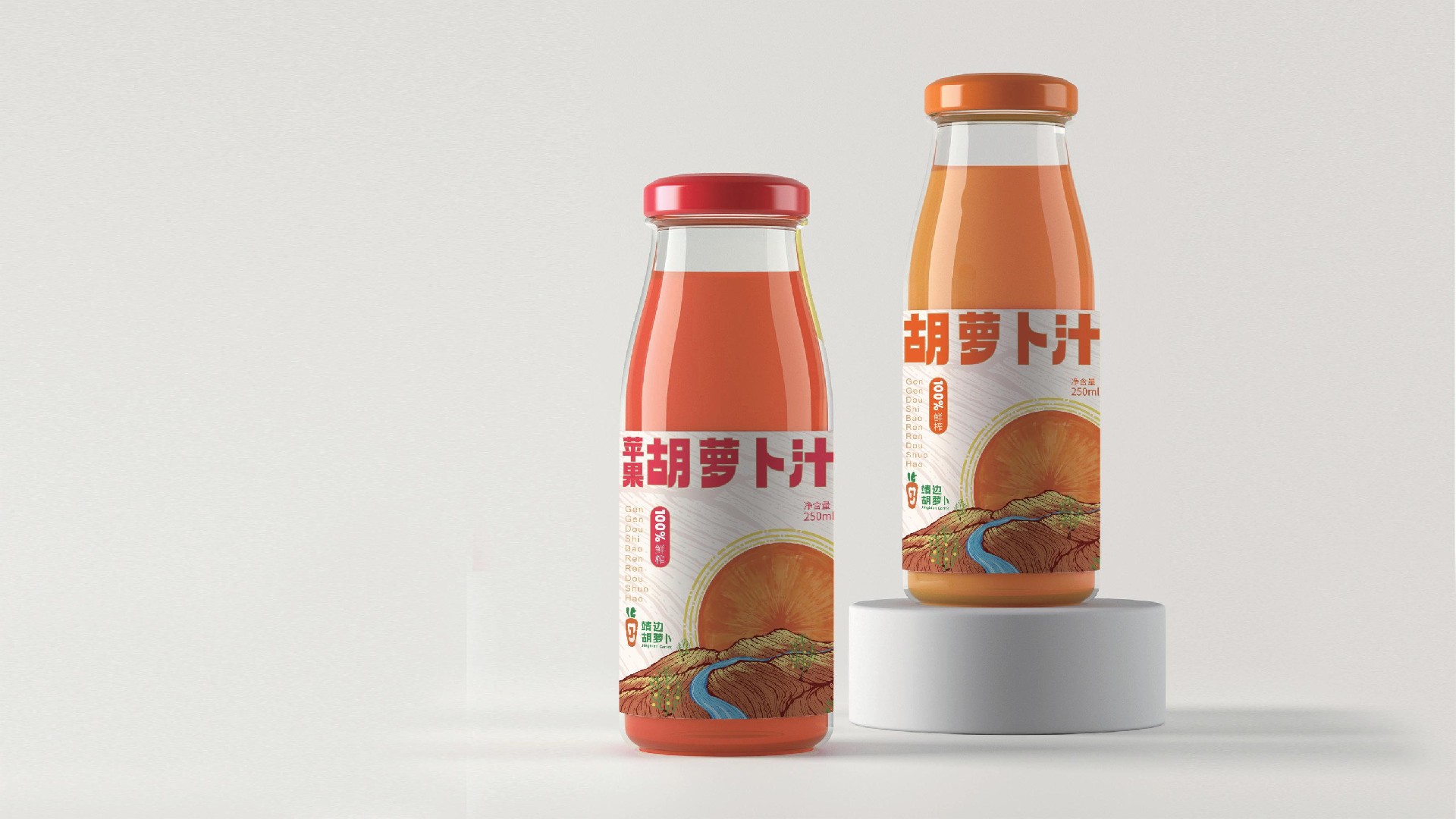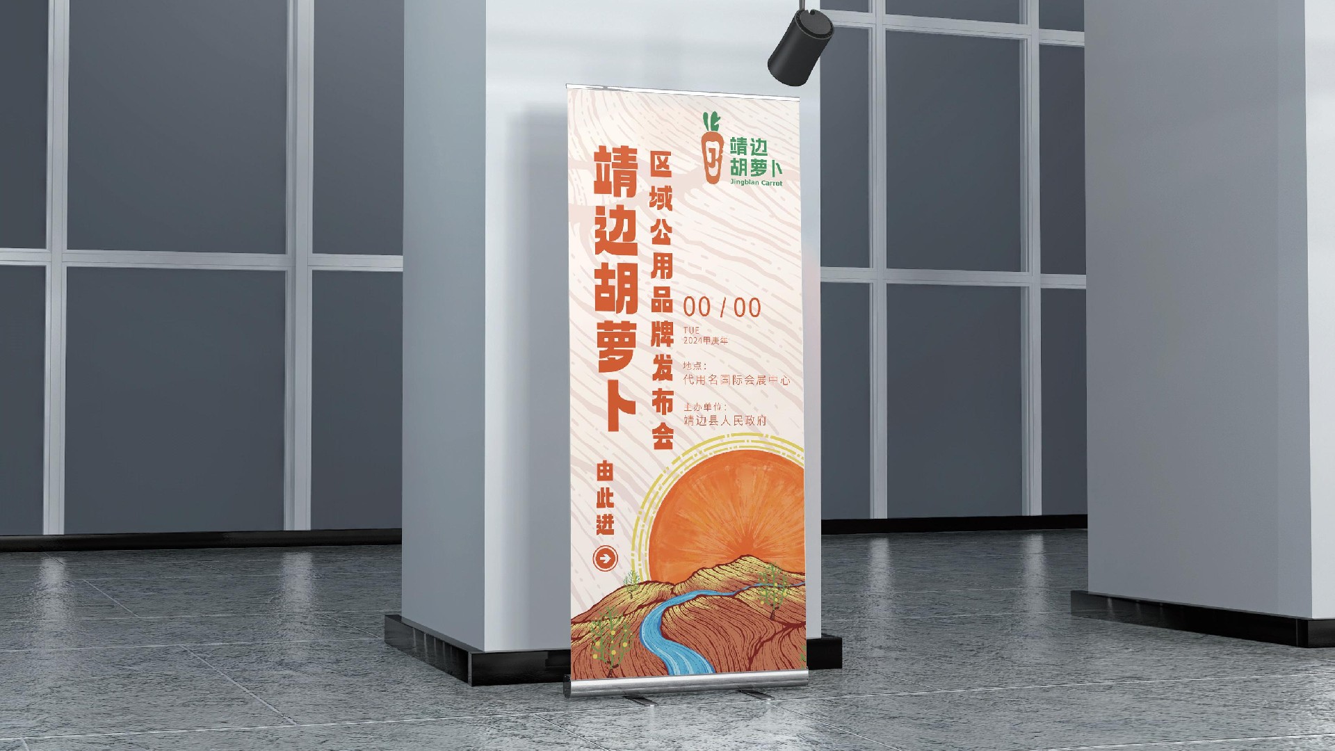 在品牌輔助圖形的設計上,以誇張手法,在靖邊最具代表的丹霞地貌之上,描繪出一輪冉冉升起的旭日,體現出豐富的光照對靖邊農産的重要意義,賦予品牌美好願景。旭日同時又是靖邊胡蘿蔔的切面,向消費者展現其果肉細膩、芯細分界不明顯的内在特征。周圍的金邊與“靖邊”同音,也寓意靖邊胡蘿蔔的金色品質。一條象征紅色文化,滋養靖邊一方土地的“小河”蜿蜒而過,爲畫面增添瞭(le)一抹靓麗的色彩。以大漠之上無邊曠野的場景描繪,帶給消費者對於(yú)靖邊胡蘿蔔的無盡美好想象。