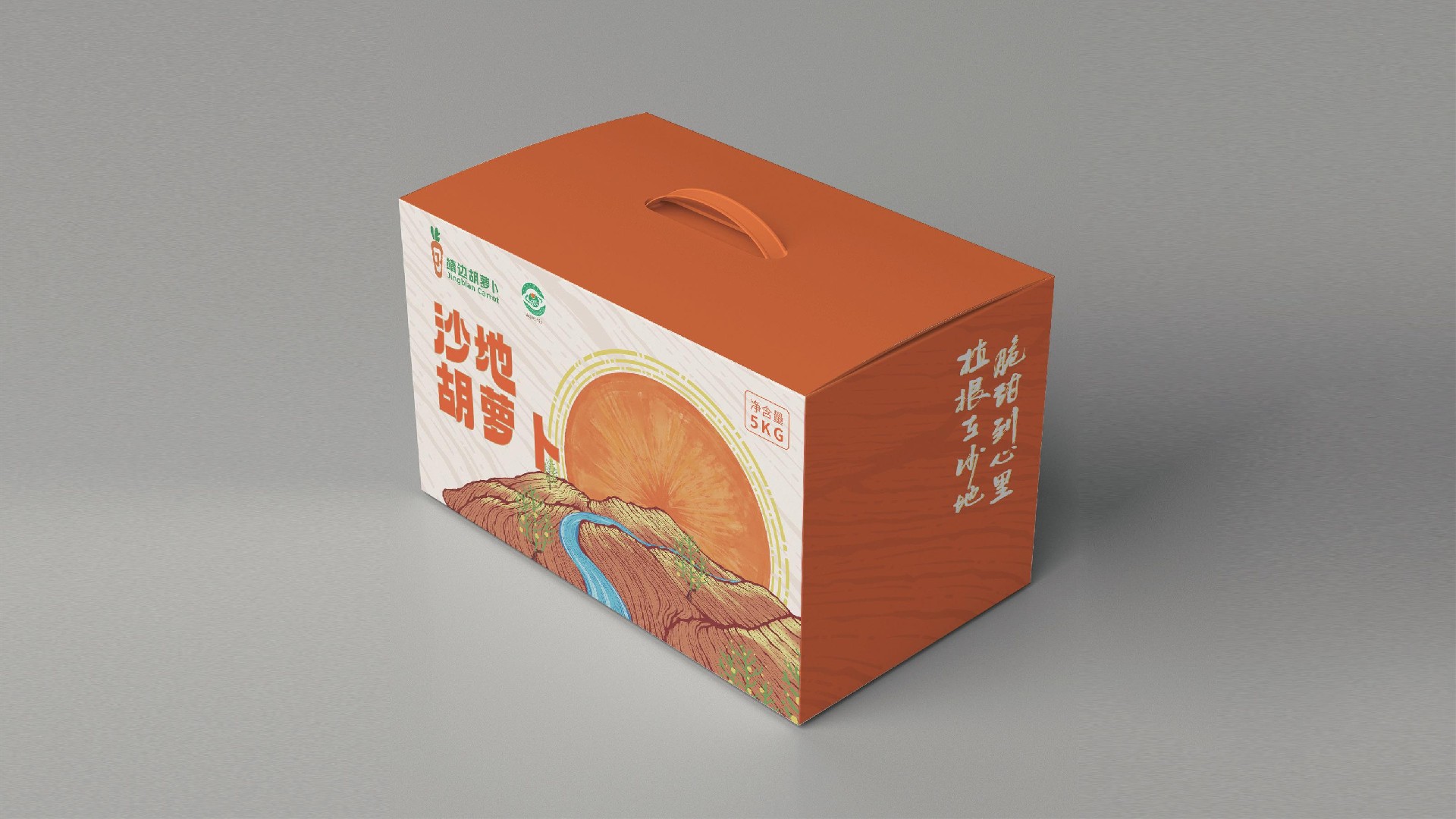 在産品包裝設計中,沿用瞭(le)胡蘿蔔與丹霞地貌的色彩作爲包裝主色調,並(bìng)與品牌輔助圖形相結合。以品牌輔助圖形中的“旭日”作爲視覺中心,並(bìng)将“沙地胡蘿蔔”作爲産品名稱突出呈現,産品信息直觀、醒目,讓消費者能夠立即區别於其他産品。