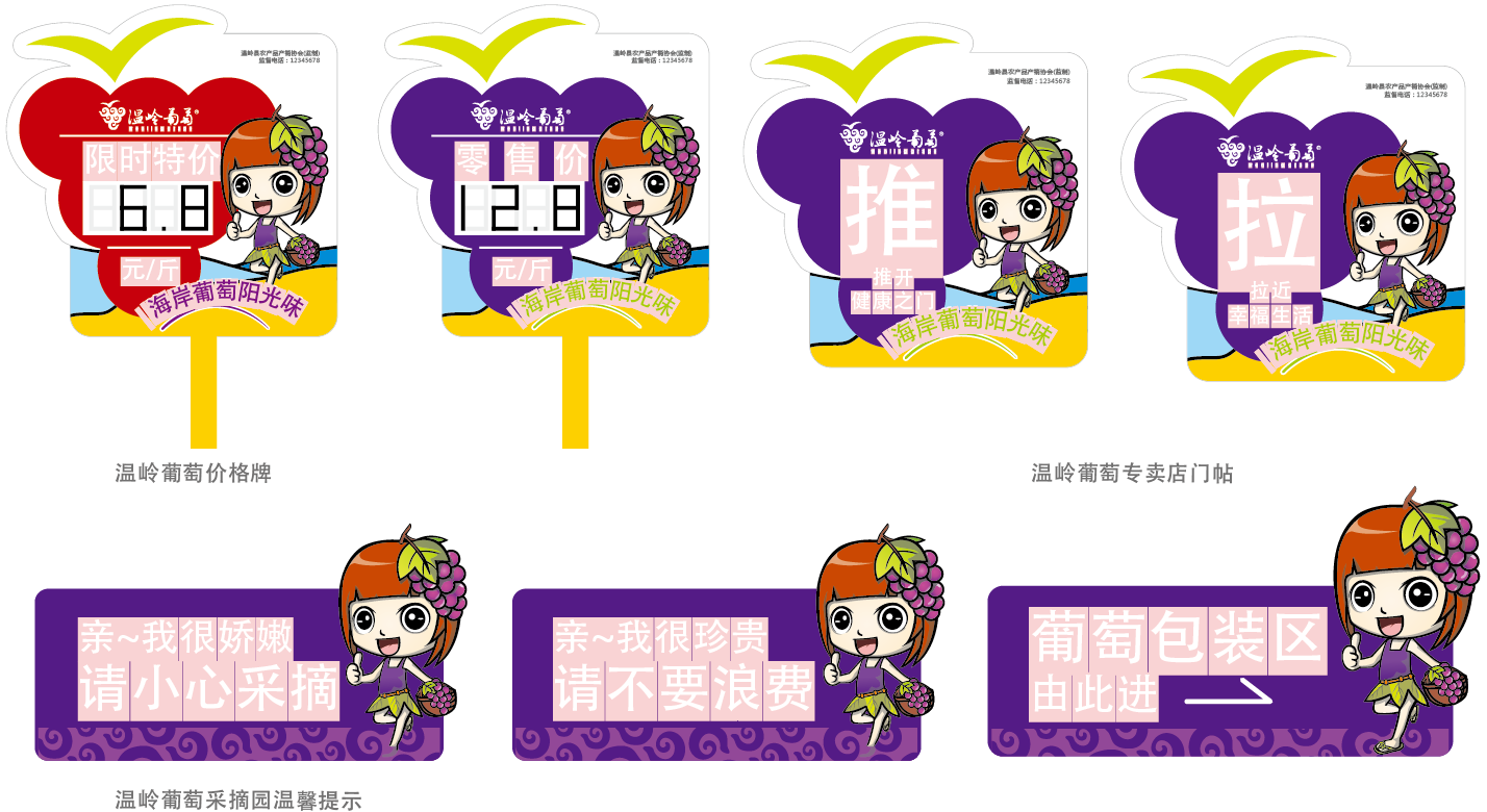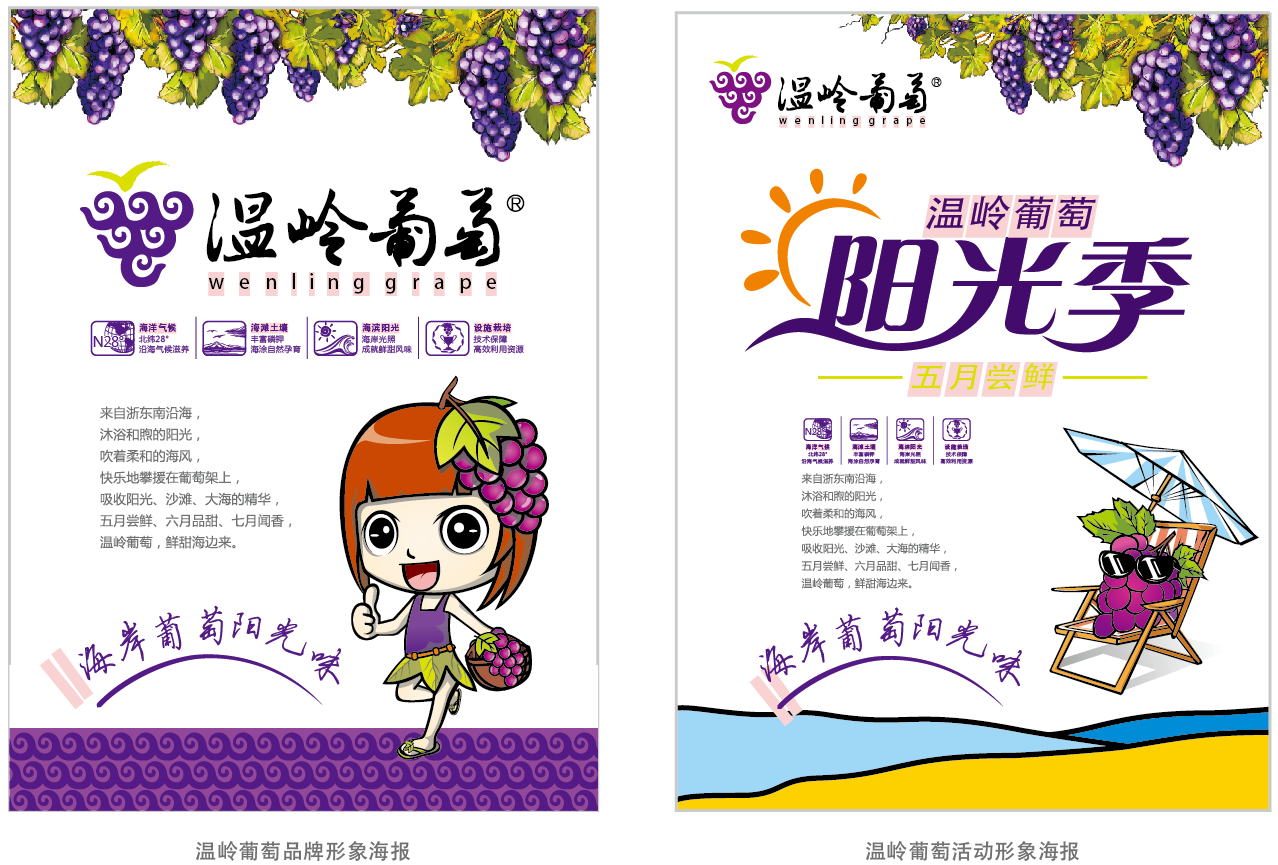 “溫嶺葡萄”品牌主形象以具有廣(guǎng)泛認知的葡萄形象爲基礎(chǔ),巧妙融入海鷗 、海浪等元素,充分展示“海岸葡萄”價值。