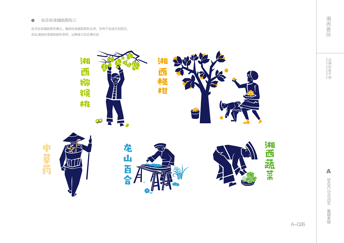 品牌主形象整體運用藍綠色調(diào),藍色凸顯湘西農産(chǎn)品的安全、優質;綠色凸顯湘西青山綠水的原生态自然環境。整體形象寓意著(zhe)熱情好客的湘西土家族苗族兒女,把大山深處孕育的天然、綠色、有機農産(chǎn)品帶給世界。
