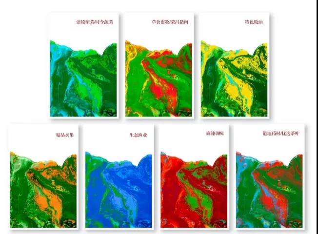 其次是傳播輔助圖形,分爲兩組:其一以重慶市地圖爲輪廓,綴以重慶的地形圖案和地标建築,表達産地來源,展現區域背書。其二是用各種色彩的丙烯以潑墨的手法呼應品牌“濃墨重彩”核心價值與品牌口号,創制品牌傳播輔助圖形,以更具藝術化的氣質呼應重慶的開放氣度和國際化風格。通過對不同色彩丙烯的濃淡、配比、走勢和紋路等進行創意,規劃團隊描摹瞭(le)重慶代表性的地形地貌,並(bìng)與特定的農産品品類進行匹配,形成産品包裝的風格和調性。