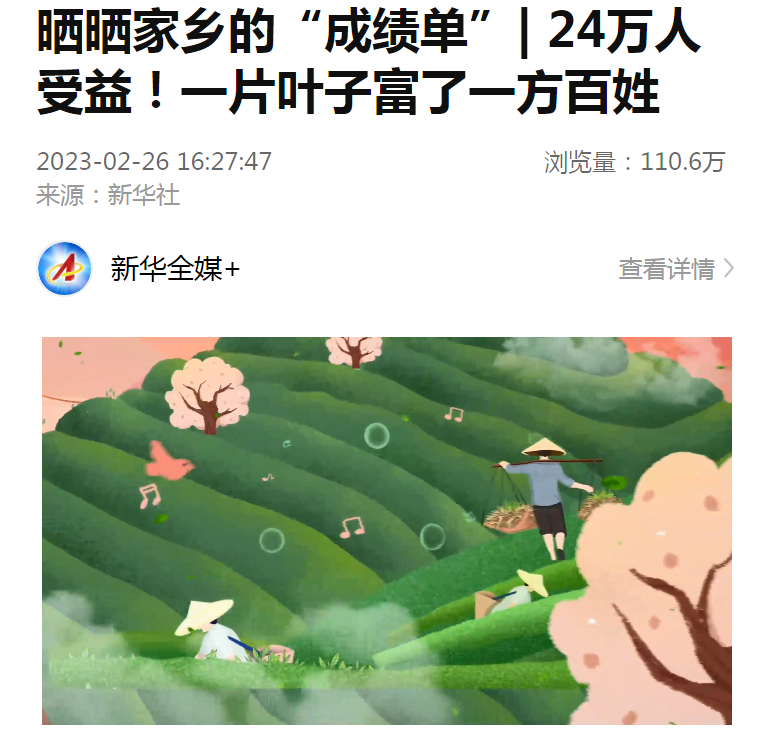 2月26日,新華社報(bào)道《曬曬家鄉的“成績單”| 24萬人受益!一片葉子富瞭(le)一方百姓》,生動地介紹瞭(le)梧州六堡茶産業的發展和帶動茶農緻富的情況,至2月27日17時,該報(bào)道浏覽量已超110萬人次。