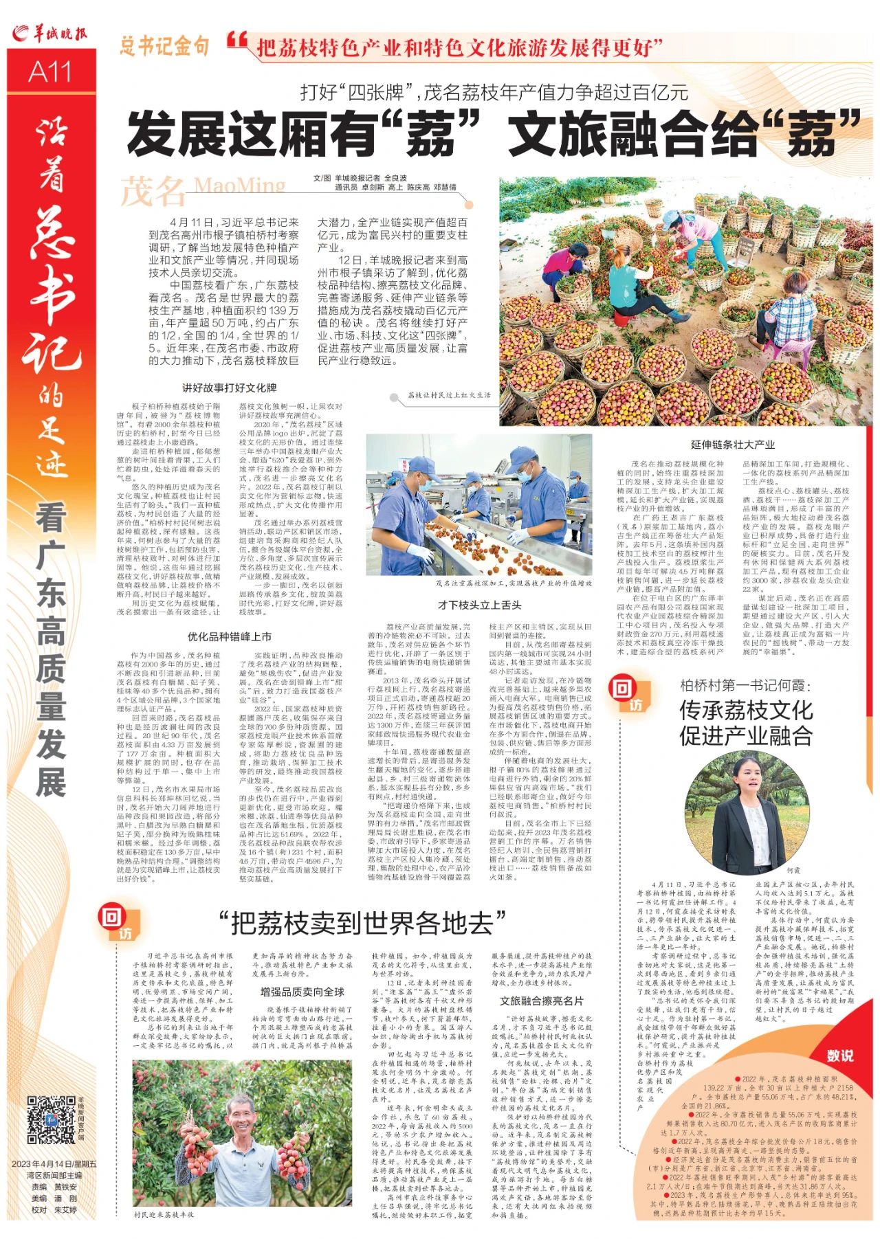 4月11日,習近平總書記來到茂名高州市根子鎮柏橋村考察調研,瞭(le)解當地發展特色種植産業和文旅産業等情況,並(bìng)同現場技術人員親切交流。《羊城晚報》以此爲契機,以“打好“四張牌”,茂名荔枝年産值力争超過百億元”,深度挖掘茂名荔枝發展之路,推介宣傳茂名荔枝。