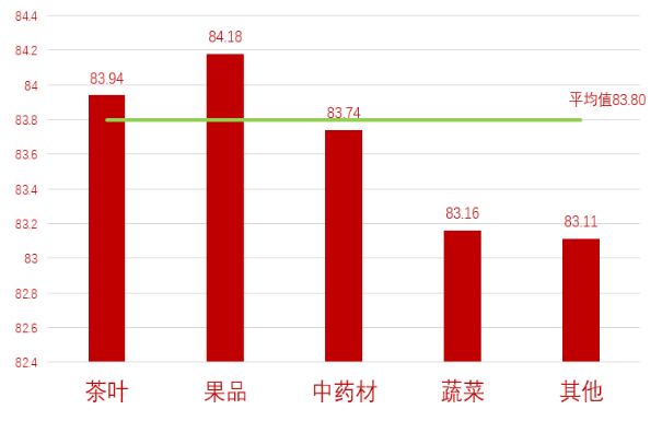 按照類(lèi)别劃(huà)分,果品和茶葉類(lèi)品牌的平均品牌網絡聲譽得分在平均水平之上,分别爲84.18和83.94。