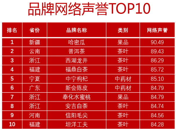 在品牌網絡聲譽前十中,茶葉類(lèi)品牌6個(gè),果品和中藥材類(lèi)品牌各2個(gè)。