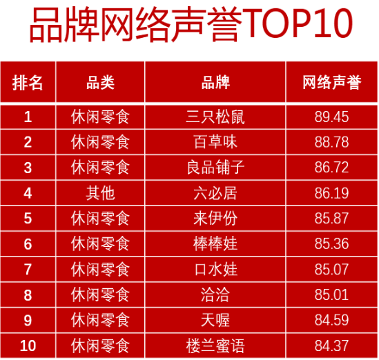 在品牌網絡聲譽前十中,休閑零食類(lèi)品牌9個(gè)。