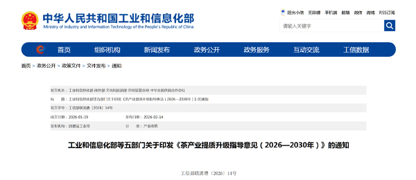 近日,工業和信息化部、商務部、文化和旅遊部、市場監管總局、中華全國供銷合作總社五部門聯合印發《茶産(chǎn)業提質升級指導意見(2026—2030年)》的通知,圍繞提升産(chǎn)業科技創新水平、培育壯大經營主體、推進特色産(chǎn)業集群建設、推動全産(chǎn)業鏈提質升級、構建茶文化價值體系、完善配套支撐體系6大方面提出瞭(le)19項重點任務。此次《意