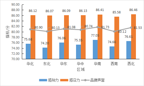 比較源自不同區域的地标品牌的品牌聲譽表現,如圖9所示,各區域的地标品牌的平均品牌聲譽均在80以上,相對而言,來自華南、西北和華東(dōng)地區的地标品牌的平均品牌聲譽具有相對優勢,分别爲81.73、81.53和81.08。從(cóng)品牌感知力上看,同樣也是華南、西北和華東(dōng)地區的地标品牌具有較高的品牌感知力,分别以77.05、76.61和76.06位列前三位。從(cóng)品牌感召力看,除西南地區平均品牌感召力爲85.58以外,其餘區域的平均值均在86.00至86.50之間,相差甚小。
