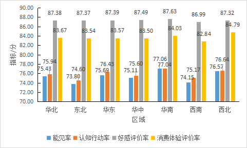 進一步比較各區域的地标品牌平均的能見率、認知行動率、好感評價率和消費體驗評價率,由圖10可見,來自華南地區的地标品牌以77.06的平均能見率明顯高於(yú)其餘區域,後續依次爲西北(76.57)、華東(75.69)、華北(75.43)、華中(75.11)、西南(74.15)和東北(73.80)。比較地标品牌的認知行動率可見,除華南地區以外,其餘區域的地标品牌的平均認知行動率均略高於(yú)該地區的平均能見率。進一步分析具體數值可見,華南地區的地标品牌的平均認知行動率(77.04)仍高於(yú)其它區域的地标品牌的平均值。比較地标品牌的好感評價率可見,各區域的地标品牌的平均好感評價率基本位於(yú)87左右,差異並(bìng)不顯著。從消費體驗評價率來看,相對而言,來自西南地區的地标品牌的平均消費體驗評價率不高,爲82.84;西北和華南地區的平均值分别爲84.79和84.03,相對較高;其餘地區的平均消費體驗評價率均在83.50至84.00之間。以上數據顯示,華南地區的地标品牌在平均品牌聲譽方面表現較優,但並(bìng)不具有顯著性。