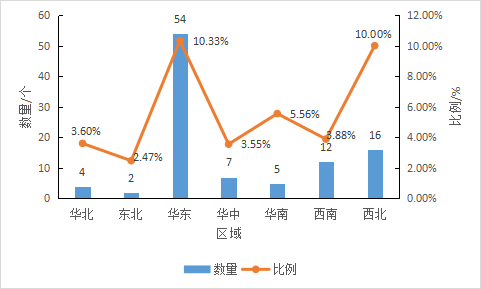 比較品牌聲譽位於(yú)前100的地标品牌的區域來源,如圖11所示,華東地區以54個品牌數量一騎絕塵,其次是西北和西南地區,分别爲16個和12個,其它地區的品牌數量均在10個以下。同時,從品牌聲譽位於(yú)前100的地标品牌的數量與相關區域獲得評價總量的比重來看,華東地區位於(yú)前100的地标品牌的比重達到瞭(le)10.33%,同樣高於(yú)其它地區;其次是西北地區,其位於(yú)前100的地标品牌的比重也達到瞭(le)10.00%。