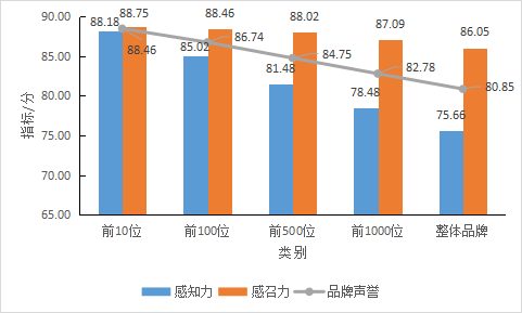 平均品牌聲(shēng)譽依次爲(wèi)88.46、86.74、84.75、82.78和80.85;平均品牌感知力依次爲(wèi)88.18、85.02、81.48、78.48和75.66;平均品牌感召力依次爲(wèi)88.75、88.46、88.02、87.09和86.05。