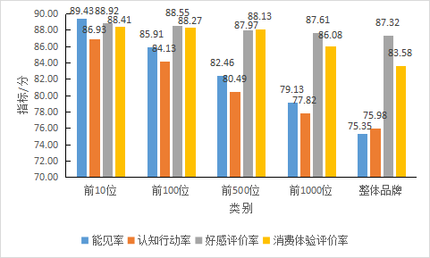 進一步比較二級指标,如圖13所示,品牌聲譽前10位地标品牌的平均能見率、認知行動(dòng)率、好感評價率和消費體驗評價率分别爲89.43、86.93、88.92和88.41,4項二級指标的評分較爲均衡;從(cóng)左至右可見,平均能見率、認知行動(dòng)率與好感評價率、消費體驗評價率之間的差距在逐漸拉開。