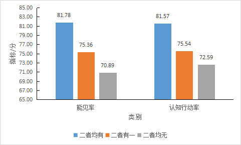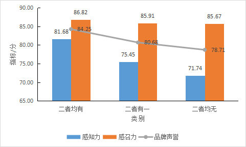 以微博、微信兩大社交媒體爲例。課題組比較瞭(le)1471個地标品牌建有兩類、一類、未建自媒體賬号的三種現狀,如圖14所示,微博、微信自媒體賬号二者均有的地标品牌,其平均品牌聲譽達(dá)84.25,平均感知力達(dá)81.68,平均感召力達(dá)86.82;二者有其一的地标品牌,其平均的品牌聲譽、品牌感知力和品牌感召力分别爲80.68、75.45和85.91;二者均無的地标品牌,其平均的品牌聲譽、品牌感知力和品牌感召力分别爲78.71、71.74和85.67。
