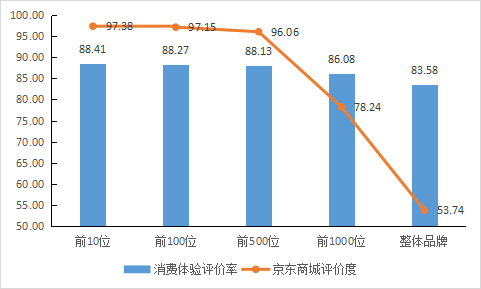 消費體驗評價率,是在好感評價率基礎上,以電商零售平台上的實際消費體驗評價的重點考量對象。數據顯示,消費體驗評價率的高低與電商平台上的消費者評價分的高低有直接關聯。以京東商城爲例,比較品牌聲譽頭部地标品牌與各層(céng)次地标品牌之間的消費體驗評價率差異,如圖16所示:品牌聲譽前10位地标品牌的京東商城評價度平均值爲97.38,前100位地标品牌的平均值爲97.15,前500位地标品牌的平均值爲96.06,相差不大。同樣的,消費體驗評價率平均值也較爲接近。到前1000位地标品牌的品牌聲譽平均值,京東商城評價度和消費體驗評價率均拉開瞭(le)距離,分别爲78.24和86.08,而1471個地标品牌的平均好評度和消費體驗評價率分别爲53.74和83.58,與前述4類不同品牌聲譽層(céng)次的地标品牌的平均值差距更爲顯著。