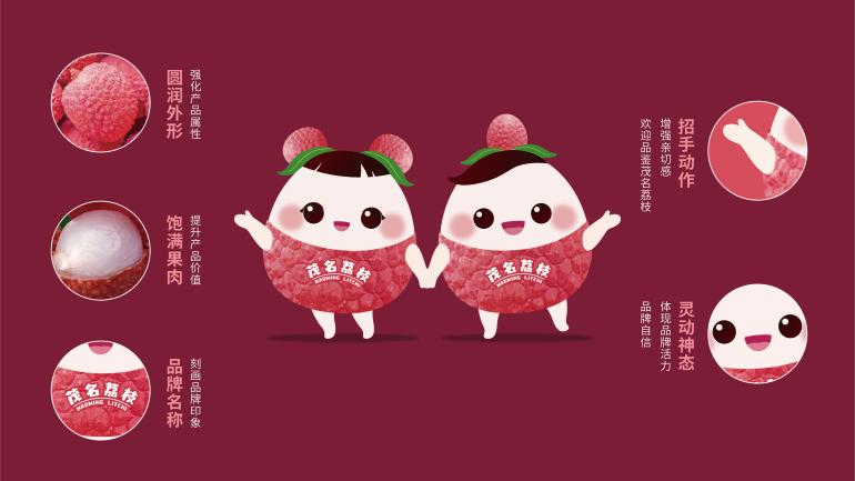 一對品牌吉祥物,形象、靈動展現瞭(le)茂名荔枝飽滿圓潤的外形,以及飽滿多汁的果肉,寓意著(zhe)品牌發展的活力與自信。