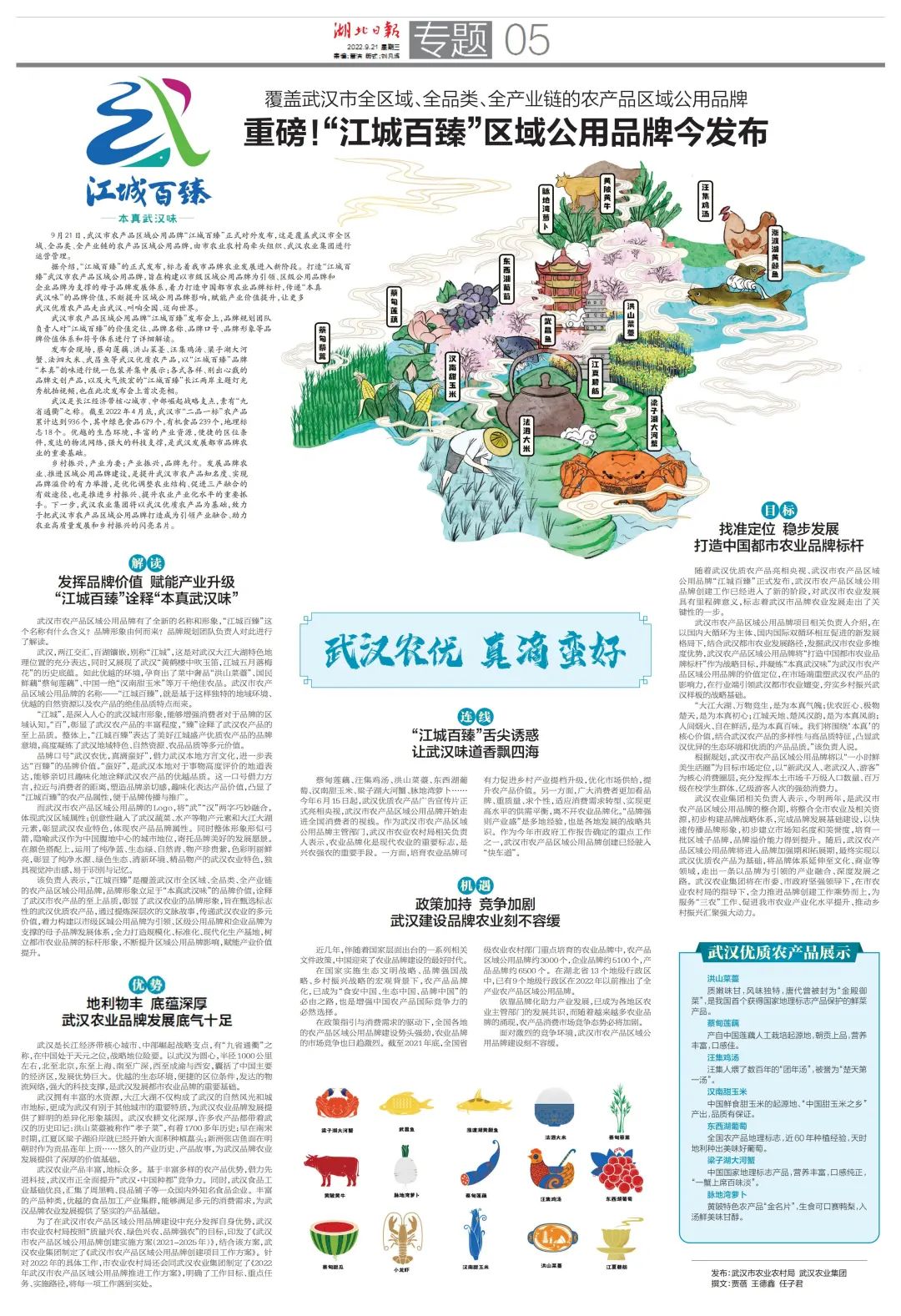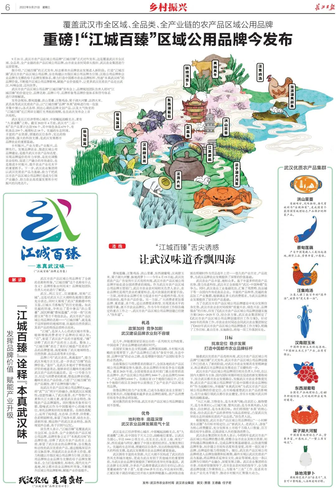 9月21日,“江城百臻”武漢市農産(chǎn)品區域公用品牌發布會在武漢廣播電視台香港路演播廳隆重舉行。武漢市農産(chǎn)品區域公用品牌“江城百臻”正式對外發布,這是由市農業農村局牽頭組織、浙江芒種品牌管理有限公司參(cān)與規劃打造、武漢農業集團進行運營管理的覆蓋武漢市全區域、全品類、全産(chǎn)業鏈的農産(chǎn)品區域公用品牌。