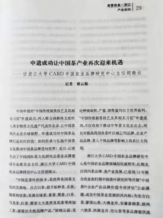 近日,新華社高級記者謝雲挺發表瞭(le)浙江大學CARD中國農業品牌研究中心主任、浙江永續農業品牌研究院院長胡曉雲的專題訪談文章《申遺成功讓中國茶産(chǎn)業再次迎來機遇》。