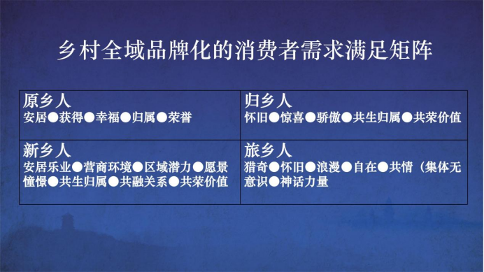 通過鄉村全域品牌化,能夠(gòu)實現“消費(fèi)者需求滿足矩陣”,讓原鄉人、歸鄉人、新鄉人和旅鄉人的需求都得到滿足。在滿足的前提下,讓鄉村真正得到再生。