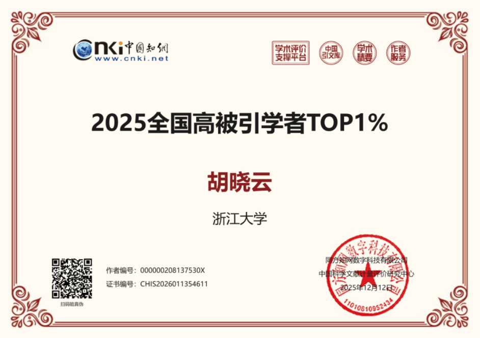 2025年,知網評價中心秉持科學、客觀、公正的原則,優化評選算法體系,繼續發布“2025中國知網高被引學者”名單(dān)。胡曉雲主任入選“2025中國知網高被引學者TOP1%”,魏春麗董事長(zhǎng)入選“2025中國知網高被引學者TOP5%”。