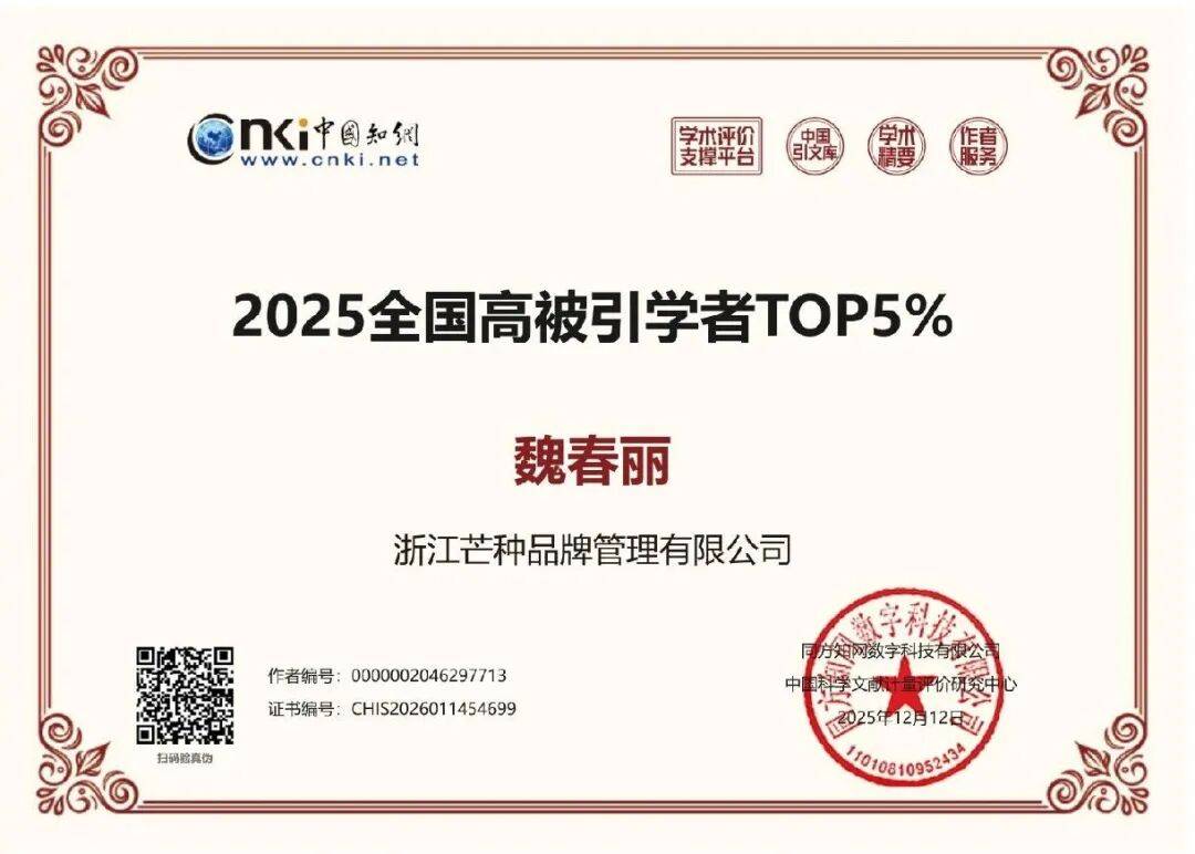 近日,中國知網中國科學文獻計量評價研究中心正式發布“2025中國知網高被引學者”名單(dān)。浙江芒種品牌管理集團專委會主任、浙江大學CARD中國農業品牌研究中心主任、浙江永續農業品牌研究院院長(zhǎng)胡曉雲入選“2025中國知網高被引學者TOP1%”,浙江芒種品牌管理集團董事長(zhǎng)魏春麗入選“2025中國知網高被引學者TOP5%”。