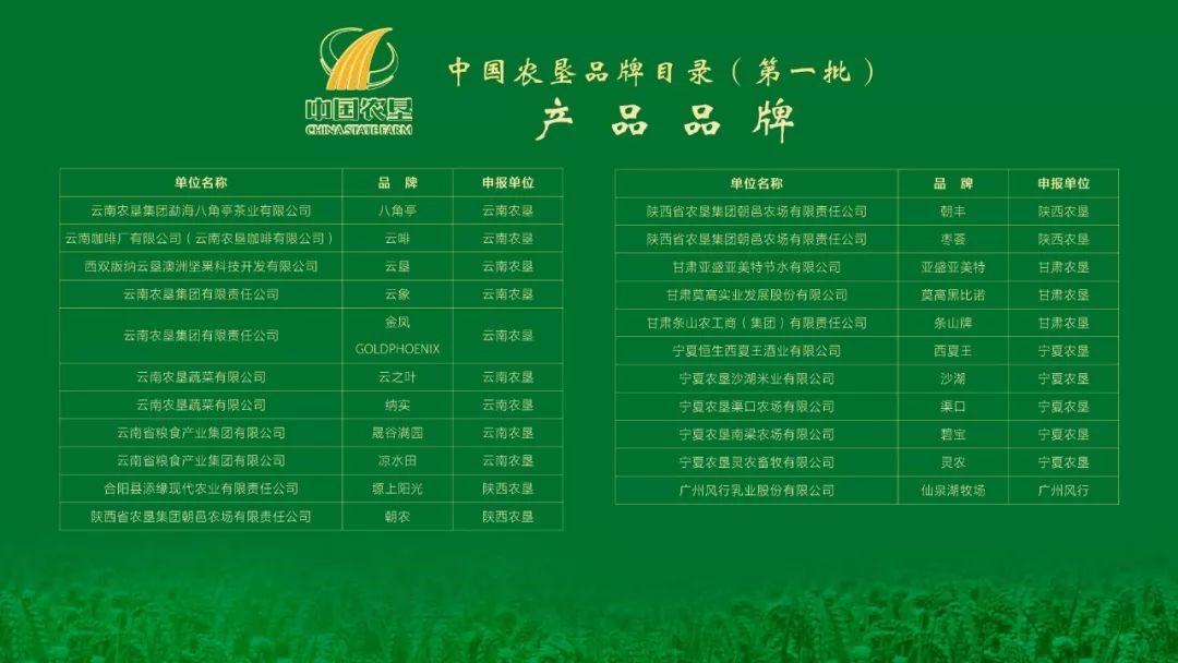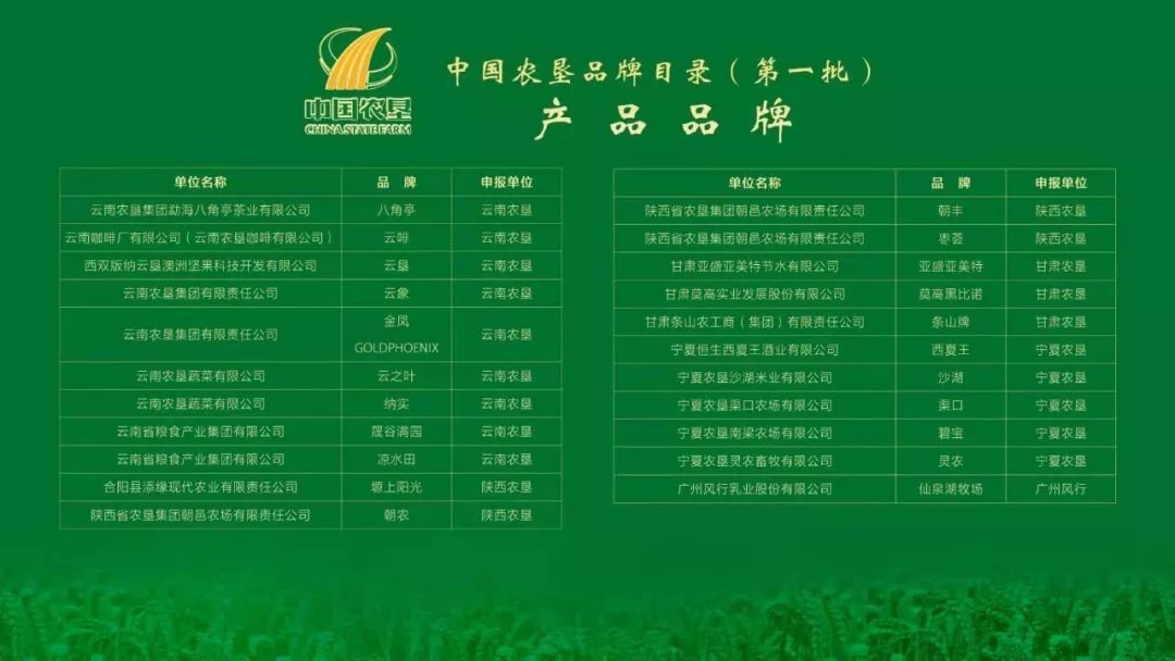 中國農墾品牌目錄(第一批)産(chǎn)品名單(dān)如下: