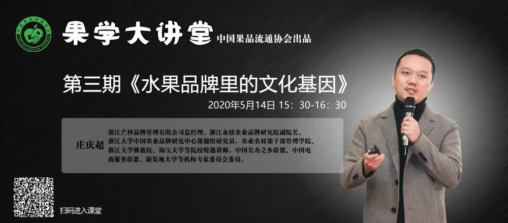 2020年5月14日,第三期果學大講堂邀請瞭(le)浙江芒種品牌管理有限公司總經理、浙江永續農業品牌研究院副院長、浙江大學中國農業品牌研究中心課題組研究員莊慶超給大家帶來“水果品牌裏的文化基因”課程。聚焦公共區域品牌的創建、戰略規劃及有效推廣,給區域品牌的發展和方向提供新的思路和方向,實現果業品牌從無到有、從少到多、從有到優,從本土市場走向國際市場,拉動産(chǎn)業發展,助力農民增收。