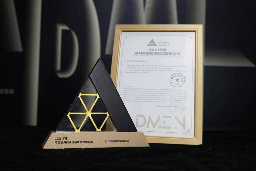 芒種品牌管理機構作爲中國三農品牌化一站式服務平台,參與ADMEN國際大獎商業價值總評榜部分獎項評選,並以專業的品牌農業服務優勢,赢得評選組委會的認可,最終榮獲“2021年度最具商業價值整合營銷公司”獎項。
