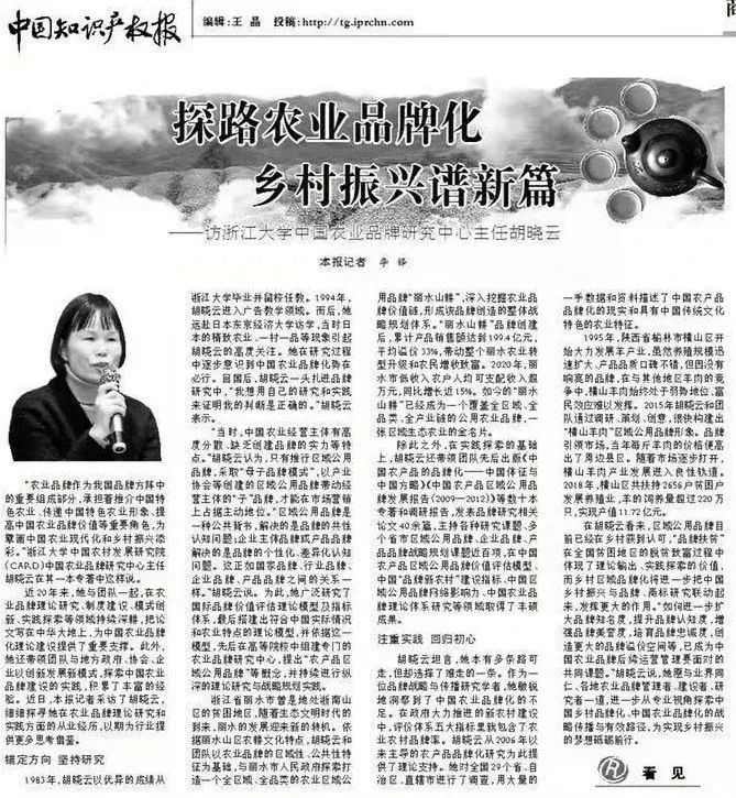 近日,《中國知識産權報》發表瞭浙江大學CARD中國農業品牌研究中心主任、浙江永續農業品牌研究院院長胡曉雲的專題採訪《探路農業品牌化 鄉村振興譜新篇》。胡曉雲主任回顧瞭十多年來從事農業品牌研究和實踐的曆程,指出擴大農業品牌知名度,提升品牌認知度,增強品牌美譽度,培育品牌忠誠度,創造更大的品牌溢價空間,已成爲中國農業品牌後續運營管理要面對的共同課題;創建區域公用品牌,採取“母子品牌模式”,以産業協會等創建的區域公用品牌帶動經營主體的“子”品牌,才能在市場營銷上占據主動地位。
