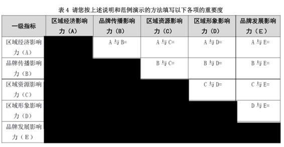 例如,在表3中,您若認爲A和B的重要性一緻則在相關(guān)處(chù)填“1”;若認爲A比B的重要性在稍微重要與明顯重要之間則在相關(guān)處(chù)填“4”;若認爲A比B強烈重要則在相關(guān)處(chù)填“7”;反之若認爲B比A強烈重要的話則在相關(guān)處(chù)填“1/7”,其他同理。