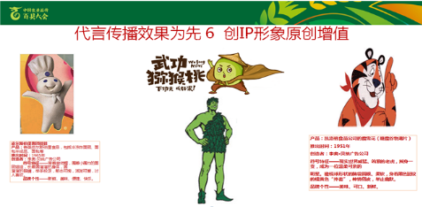 當選擇一個代言人的時候,我們一定要反複問自己,他到底能夠帶來什麽。請一個成本代價非常高的明星時,一旦他出現問題,或爆出負面消息,整個品牌戰略都要調整,這對品牌來講,是非常大的風險。美國在1996年時曾評過二十世紀最具品牌影響力的品牌形象,獲勝的幾乎全是虛拟代言人。這些虛拟代言人是我們品牌設計者去創造、掌控的,這意味著(zhe),它們能夠控制或根本沒有負面信息。今天談起IP形象,有人認爲,就隻是做個logo,或者隻是做一個虛拟代言人的設計。其實,原創是根本,但隻是一個IP的原創設計還遠遠不夠,要做好IP形象,需要一直延續下去,一直講故事。比如說武功猕猴桃,我們設計瞭(le)一個IP 形象,而這個形象,應當不斷的煥發生命的精彩,講武功小子的故事,才是有價值的。