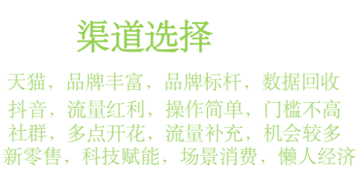 目前,電商渠道包括瞭(le)天貓、淘寶(bǎo)、京東、抖音小店、微店、線上團購等等。除瞭(le)極個别大企業會進駐所有渠道,大部分企業還是要選擇合适的渠道進行精準突破。