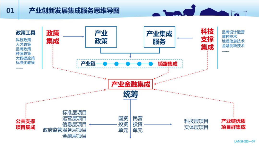 産(chǎn)業集成創新的核心是依據産(chǎn)業現有形态以市場爲導向、以問題爲導向、以目标爲導向建立産(chǎn)業鏈模型。以錫林郭勒蘇尼特羊産(chǎn)業爲例,産(chǎn)業鏈模型是分層(céng)構建的,包括産(chǎn)業鏈标準層(céng)、信息層(céng)、金融層(céng)、政府監督服務層(céng)、品牌層(céng)、人才培訓層(céng)等 ,以市場需求找到各層(céng)的斷點,進行體系化分析與設計,形成産(chǎn)業鏈數字模型,進而形成區域公用品牌運營建設項目庫,這樣的集成建設流程可以最大限度的降低産(chǎn)業運營的風險和政府投資風險。